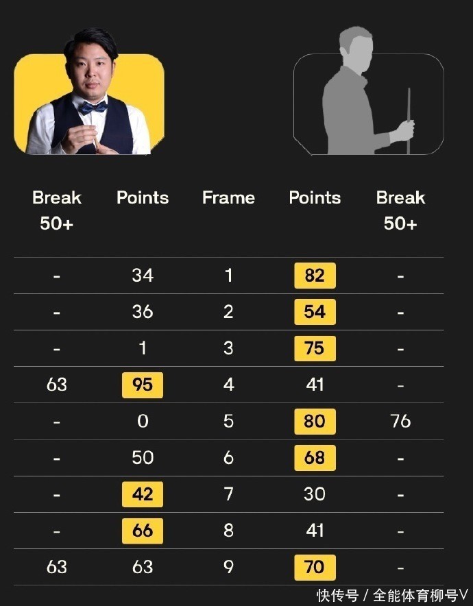 第三局,张安达情景依旧欠安,周金豪又以75-1简短胜出,比分上风扩大到3-0。第四局,开场连输三局的张安达终于有所斩获,他打出单杆63分,95-41扳回一局,比分追成1-3。