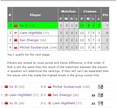 第29小组除了徐想和范争一两位中国选手除外,另外两名参赛球员是14岁小将米哈乌-苏巴尔奇克、以及34岁宿将利亚姆-海菲尔德。